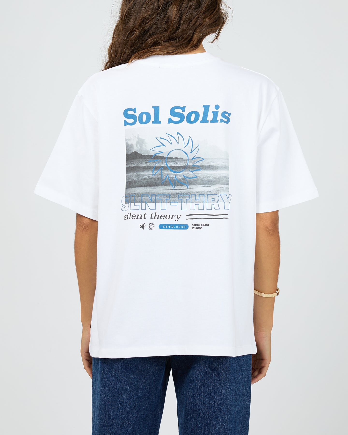 Inspired by vintage surf graphics, the Sol Solis Tee is the perfect on the go relaxed tee. Made from a heavy weight cotton jersey, this tee features an oversized fit with small front hit and large beach inspired back print. Pair back with your favourite Silent Theory denim and sandals for the ultimate relaxed summers day look.